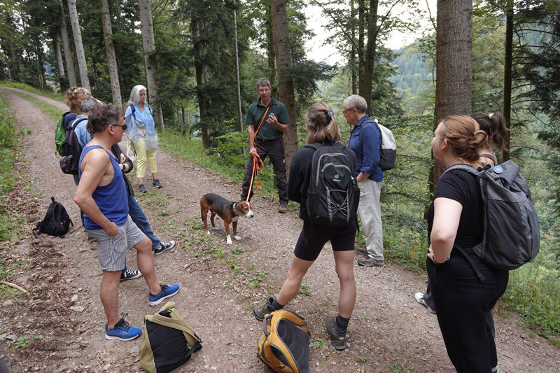 Dass auch für den Schwarzwald das Anthropozän – d.h. das Zeitalter, in dem die Menschen die Umwelt nicht nur lokal, sondern global verändern – wesentlich vor das 20. Jahrhundert zu datieren ist, wurde auf einer Waldführung mit Revierleiter Siegfried Huber im vorderen Lierbachtal deutlich: So war das deutsche Mittelgebirge vor rund 200 Jahren aufgrund von Übernutzung fast völlig kahlgeschlagen. Die aktuellen Herausforderungen der steigenden Temperaturen für die regionale Forstwirtschaft führte der Förster eindrücklich vor Augen – vorbei ging es an Tannen mit kargen Kronen, an einer Südhanglage mussten Buchen gefällt werden, die der Trockenheit der letzten Jahre nicht mehr standhalten konnten. Siegfried Huber plädierte für eine aktive Waldbewirtschaftung als aktiven Klimabeitrag: „Ein naturwüchsiger Wald, der sich selbst überlassen bleibt, hat ab einem bestimmten Zeitpunkt einen Sättigungsgrad, CO² zu binden, erreicht. Wenn wir den Wald hingegen nachhaltig ohne Kahlschläge bewirtschaften und das eingeschlagene Holz im Bau einsetzen, binden wir über Jahrhunderte wesentlich mehr Kohlendioxid.“