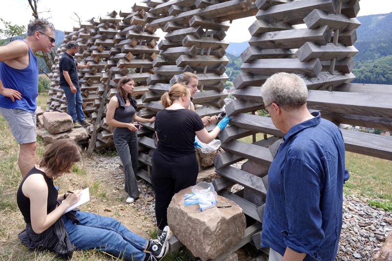 In mikroskopische Dimensionen der NATUR-Skulptur dringt hingegen Prof. Dr.-Ing. Clemens Posten (KIT, Bioverfahrenstechnik) ein. Mit Hilfe der Studentinnen hat er von allen Buchstaben Holzproben entnommen, die dann konserviert und analysiert werden sollen, um herauszufinden, welche Mikro-Organismen und Pilze spezifisch an der Zersetzung der verschiedenen Holzbuchstaben beteiligt sind.