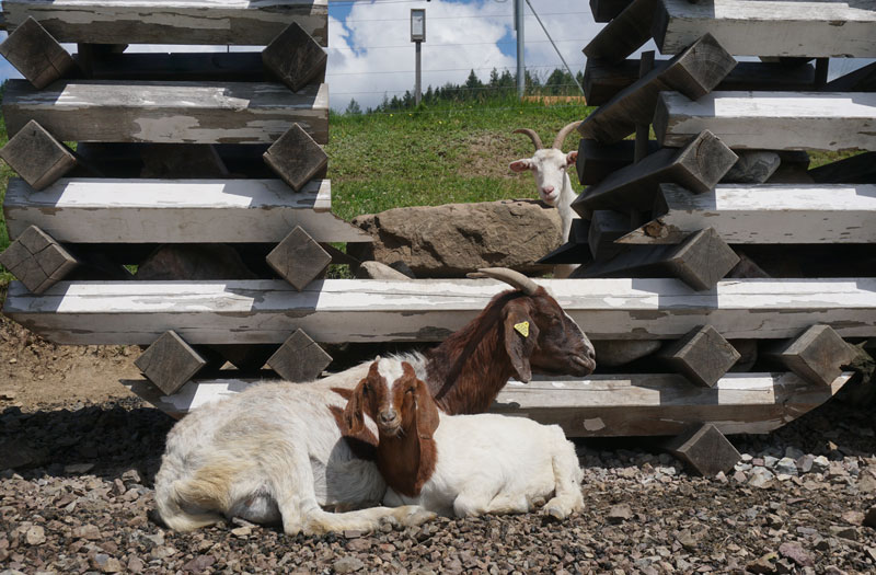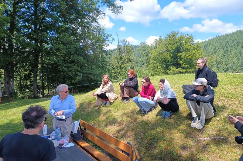 Im Sommer 2024 unternahm bereits zum zweiten Mal ein Karlsruher Seminar eine Exkursion zur NATUR-Skulptur, diesmal mit Studierenden und Lehrenden sowohl vom Institut für Kunst- und Baugeschichte des Karlsruher Instituts für Technologie (KIT) als auch von der Staatlichen Hochschule für Gestaltung Karlsruhe (HfG). Nach einer Waldführung durch Revierleiter Siegfried Huber wurde die die rund zwanzigköpfige Exkursion unter der Leitung von Prof. Susanne Kriemann und Dr. Jens Hauser auf der Kleineben beim eigentlichen Ziel der Exkursion von Ziegen begrüßt: der NATUR-Skulptur. Im Vergleich zur Exkursion im Vorjahr konnten bereits mit bloßem Auge sichtbare Veränderungen festgestellt werden. Die Versilberung insbesondere an den wetterexponierten Stellen war noch weiter fortgeschritten, was den verschiedenen Hölzer weiter an Charakter verleiht. An feuchteren Stellen insbesondere zum Berg hin, konnten leicht grünliche Oberflächenverfärbungen beobachtet werden, was auf eine Besiedlung von Algen schließen lässt.